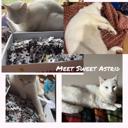 She’s a beautiful white cat with two different coloured eyes. Astrid came into our care in September 2025 after arriving to the door of her feeders with 2 newborns. They all came into care so Astrid could safely raise her babies. Astrid wasn’t feral but she wasn’t used to the indoor life and she was very protective of her new babies around the other fosters in care with her. She’s slowly starting to relax into the pet life now that her kittens have moved onto their forever homes but she’s still a bit stressed sharing with other cats. She can be very sweet like when she comes around your feet and hops up on the table or you looking for rubs but she’s still building confidence so she needs a quiet home with humans who will respect her boundaries and give her the time to fully embrace the pet life. We would like her to be the only cat in the home initially and when she has fully settled a new cat could be introduced (using the proper introduction method of course!).