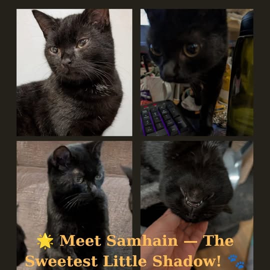 My name is Samhain. (I was rescued on Halloween!), I am a 6 month old female kitten.